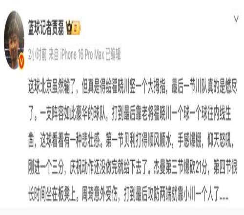 贾磊这段文字既是对老将翟晓川的夸奖,也是对北京教练组使用外援办法的不满,此役杰曼砍下29分,第三节轰下21分,贝利则入账11分,北京队内只有3人得分上双,另外一人是翟晓川的15分。