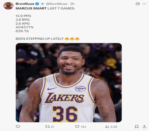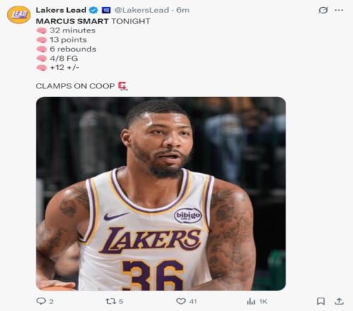 随后在詹姆斯上篮偏出时斯玛特从天而降完成补篮,这一球后湖人再度领先到3分,末节斯玛特拿到7分4篮板1助攻1盖帽(5中2+罚球5中3)。