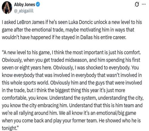 湖人队另外一名核心詹姆斯也对东契奇的表现给予认可:“他的比赛进入到了全新的层次,这与他的适应程度有关,他在达拉斯度过了7、8年时间,然后在赛季中期被交易,对于任何人来说都是一个震惊的消息。”
