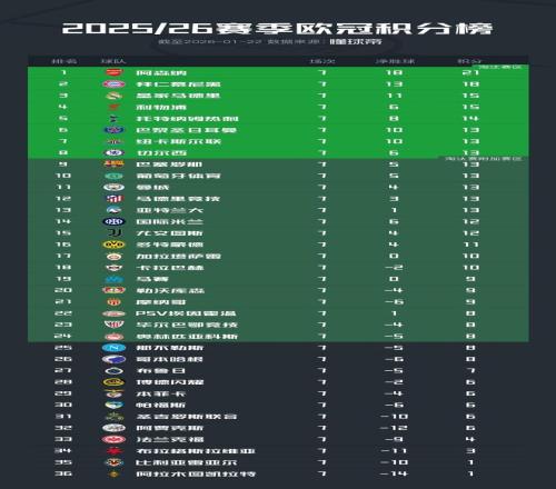北京时间1月22日,2025/26赛季欧冠联赛阶段第7轮的比赛全部结束,积分榜的形势也产生了进一步的变化。